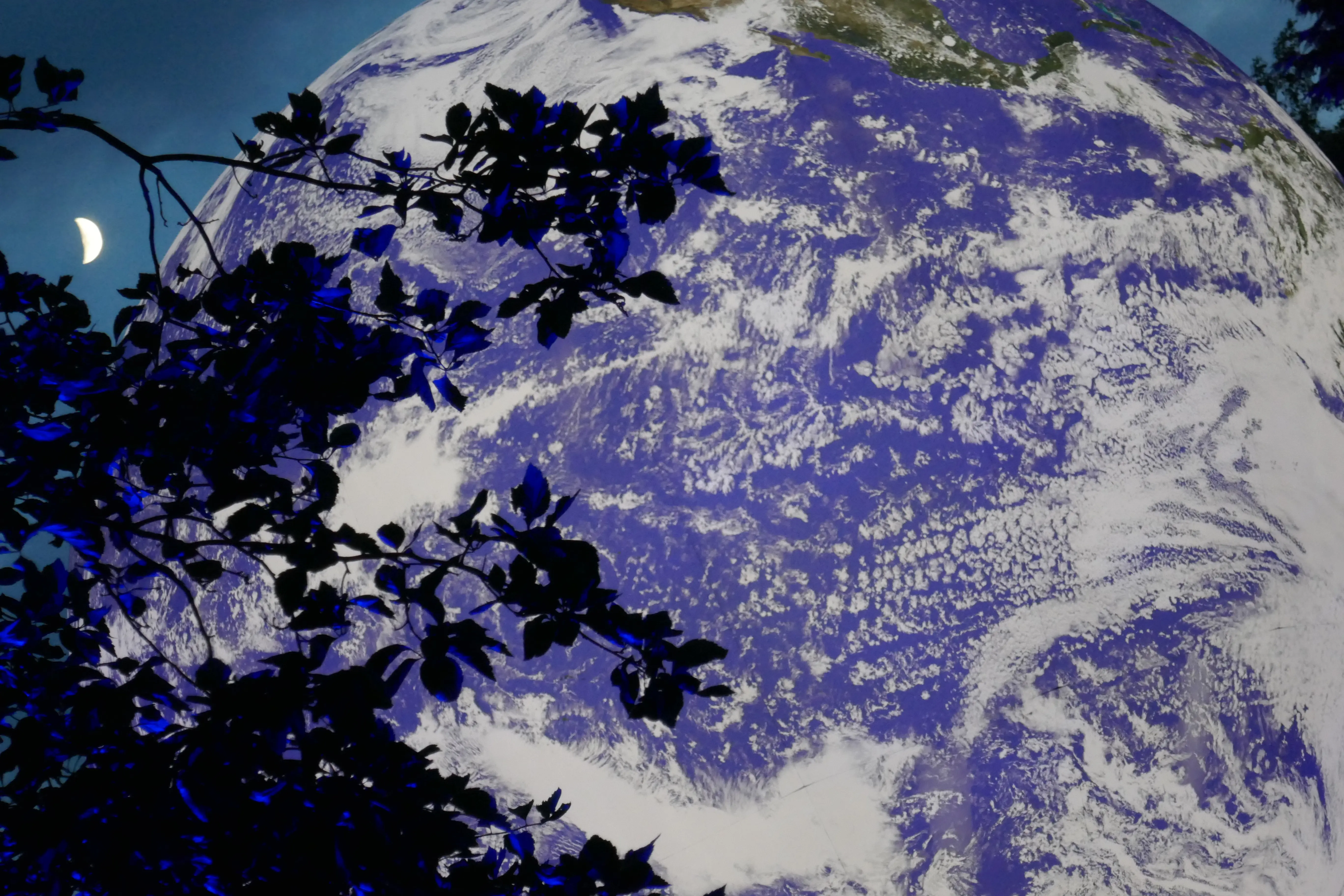 Ein Erdball mit 6 Metern Durchmesser schwebt im Kirchenschiff und ermöglicht den Besucher*innen einen einmaligen Blick auf den blauen Planeten. Die besondere Perspektive auf unsere Erde hat man sonst nur aus dem Weltall, z.B. als Astronaut auf der ISS.